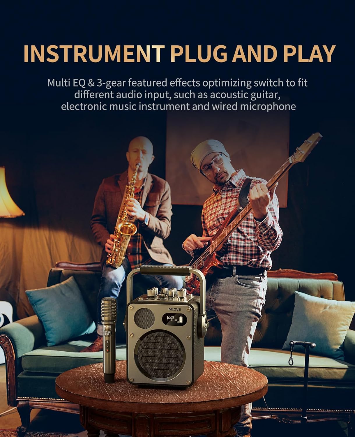 The karaoke machine for adults has 6 EQ - music, karaoke, electronic wind instrument, electronic organ, guitar, folk music ( last 4 EQ only for CH1 & CHB ), and 3 reverb modes - hall, room and Echo.